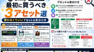 アセット 【Unity】最初に買うべきアセット3選と「買わなくていい」アセットの見分け方 今回は、Unity初心者の方を対象として序盤に購入するべきアセットと、買う必要は特にないアセットについて見分け方を紹介したいと思います。はじめに:アセット選びで一番多い失敗Unityのアセットストアを初めて開いたとき、「何を買えばいいかわか... 2026.04.26 アセット