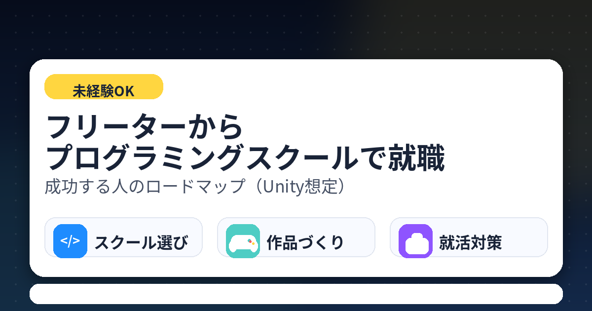 まずは、あなたが狙う副業領域(Web/Unity)を決めて、その領域で「ポートフォリオを完成まで見てくれるスクール」を探す。そして無料相談で、案件獲得までのサポート内容を確認する。